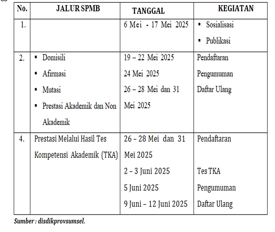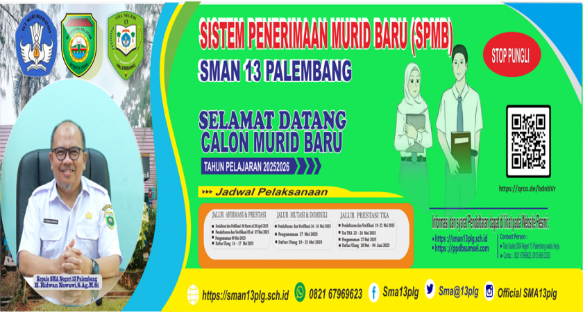 Kami informasikan kepada semua masyarakat wilayah kecamatan sukarami dan kecamatan Alang-alang lebar SISTEM PELAKSANAAN PENERIMAAN MURID BARU (SPMB) pada tahun ini akan berbeda dengan tahun-tahun sebelumnya dimana SMA NEGERI 13 PALEMBANG melalui DINAS PENDIDIKAN PROVINSI akan melaksanakan PPDB secara serentak bersama SMA di seluruh wilayah Provinsi Sumatera Selatan dengan mengacu pada Aturan pusat dan daerah berdasarkan Permendikdasmen No.3 Tahun 2025 dan Kepsekjend No. NOMOR 47/M/2023 dan Peraturan Gubernur No. 186 Tahun 2025, tentang Pelaksanaan SPMB melalui tahapan jalur Seleksi diantaranya : Domisili, Afirmasi, Prestasi Akademik Non Akademik, Mutasi, Tes Kompetensi Akademik (TKA) Pelaksanaan akan dilaksanakan secara serentak sejak Tanggal 19 Mei s.d. 28 dan 31 tahun 2025 Mendatang. maka kami sampaikan informasi ini kepada masyarakat agar dapat lebih memahami proses pelaksanaannya nanti dan secara jelas berikut jadwal pelaksanaan SPMB tahun pelajaran 2025/2026. Pengumuman Hasil Seleksi secara serentak. Demikianlah informasi ini kami sampaikan semoga informasi ini dapat membantu untuk mengikuti pelaksanaan Penerimaan Calon Murid Baru ini Terimakash.